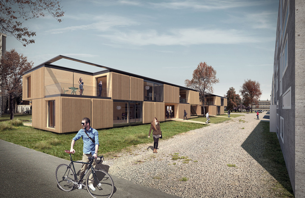 Bei den UrbanBoxes handelt es sich um ein modulares System aus Holzboxen, die im Werk gefertigt und vor Ort zu Modulen zusammengefügt werden.