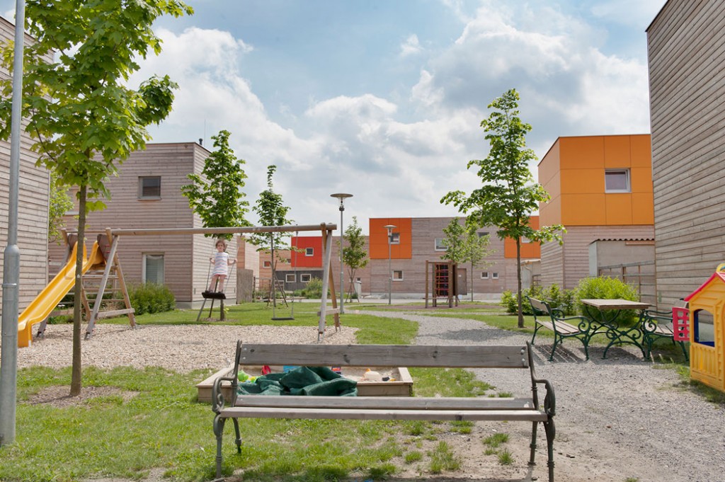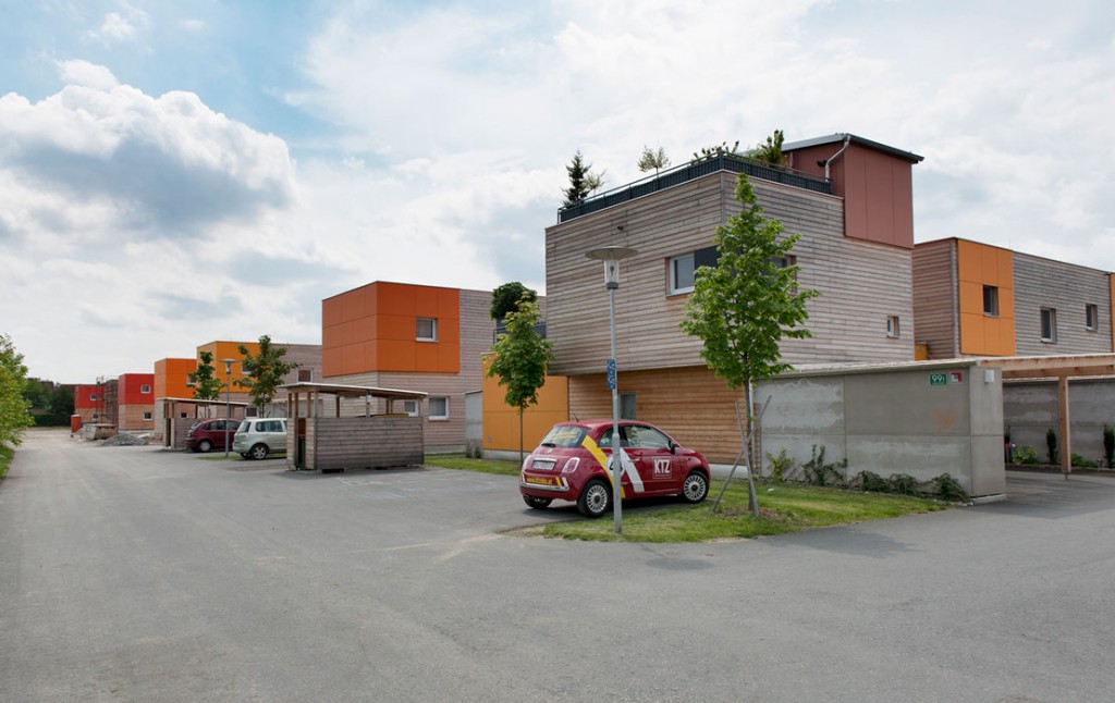 Die Reihenhäuser sind aus flexiblen Modulen zusammengesetzt, wodurch ein freies Spiel von Baukörpern und Durchblicken entsteht. Entsprechend den Bedürfnissen und Wünschen der Bewohner gestalten diese ihr Haus und privaten Freiraum, indem zusätzliche Raumwünsche in verschiedenen Erweiterungszonen frei wählbar sind. Das private Grün ist durch Pergolen und Abstellräume gestaltet, wodurch eine hofartige Bebauung entseht. Die Gesamtanlage (58 Wohneinheiten) ist in vier Teilbereiche gegliedert, die über eigene Freiräume verfügen und eine durchgängige Siedlungsmitte bilden. Niedrigstenergiehäuser nach den Klima aktiv Kriterien in Verbindung mit CO2 neutraler Holzbauweise verleihen dieser Siedlung einen hochwertigen ökologischen Fussabdruck.