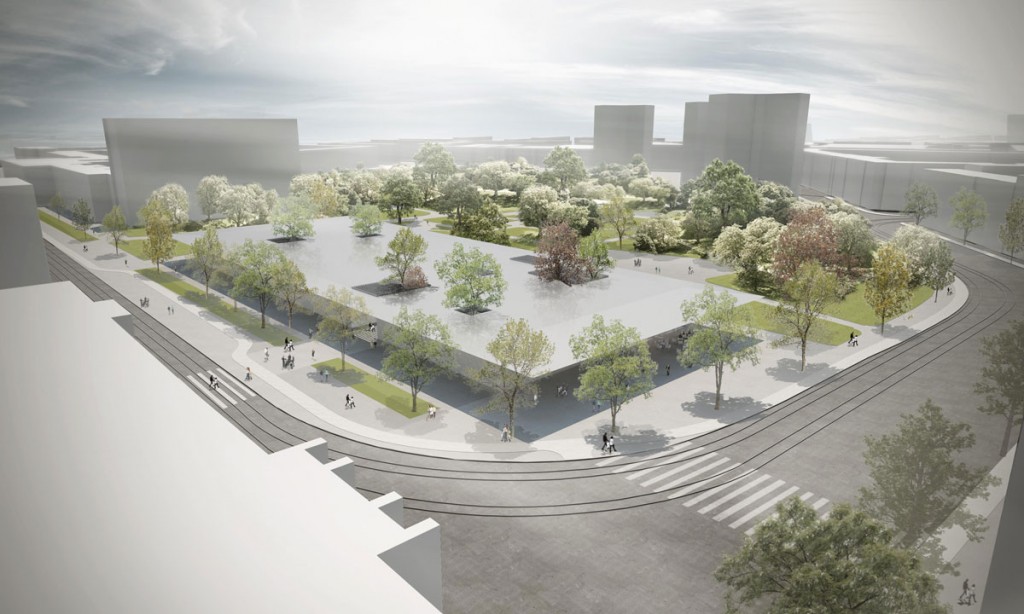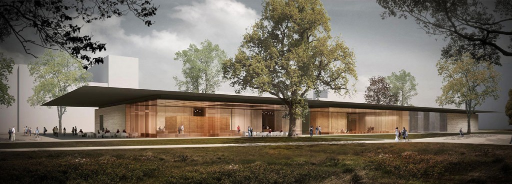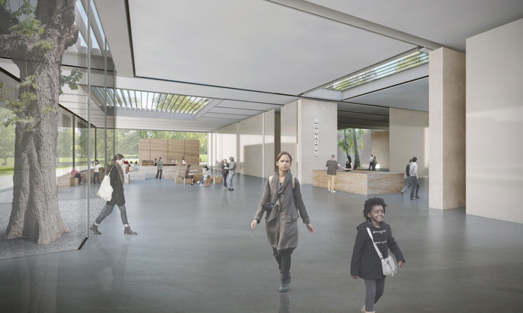 Unser Entwurf positioniert sich als flacher und – unter allen Nennungen als einziger – eingeschossiger Baukörper. Ein leichtes, nach allen Seiten weit auskragendes Dach erzeugt eine räumliche Verschränkung des Museums mit Park und Stadtraum. Es kommuniziert eine einladende Geste und schafft witterungsgeschützte Außenbereiche für Museums- sowie Parkbesucherinnen. Durch seine Positionierung am Bauplatz vermittelt das Museum als Schnittstelle zwischen Natur und Stadt.
