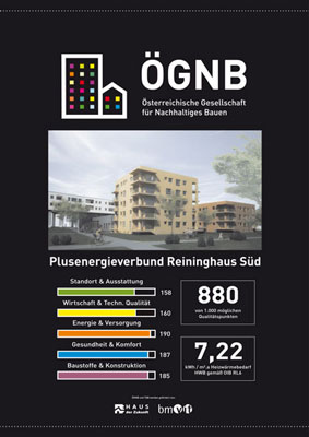 Im Rahmen des Bau Z Baukongresses in Wien wurden dem Projekt Zentrum Reininghaus Süd die Plaketten von ÖGNB und klima:aktiv feierlich übergeben. Die Auszeichnungen hat das Projekt schon lange, nun fand die offizielle Übergabe statt. Anwesend waren unter anderem Projektpartner Karl Höfler von der AEE INTEC und der Bauherr Martin Partoll, Geschäftsführer von AktivKlimahaus.