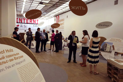 Bei der diesjährigen Architekturbiennale in Moskau lieferte die Steiermark einen erheblichen, interessanten Beitrag zur zeitgenössischen, österreichischen Holzarchitektur. Auf Kreisrunden Scheiben wurden 17 Projekte herausragender Beispiele für Holzbau gezeigt. Weiters wurde holzverarbeitenden Firmen die Möglichkeit geboten, sich einem breiten Publikum medienwirksam zu präsentieren und Kontakte zu knüpfen. Mehrere steirische ArchitektInnen nahmen die Möglichkeit wahr sich an dieser Reise zu beteiligen.